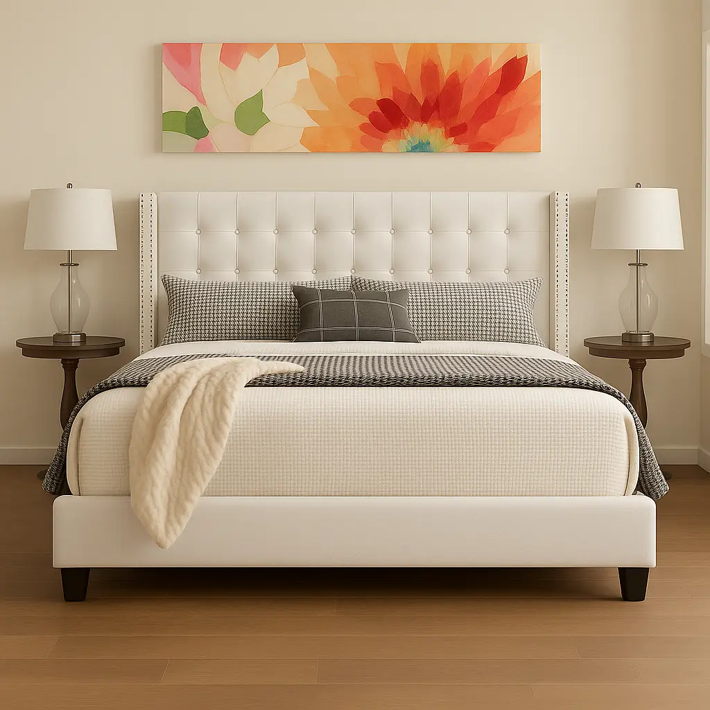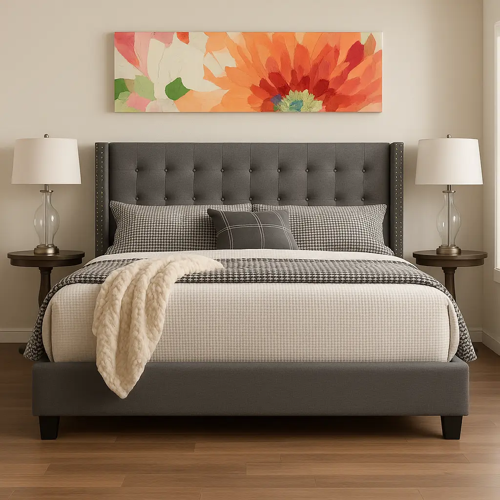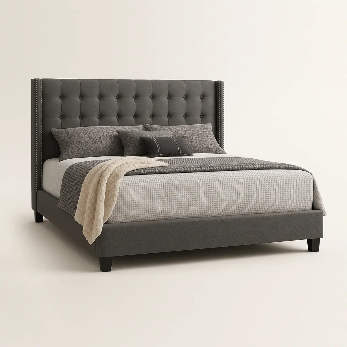 At Asghar Furniture, Modernize your bedroom with the elegant Moniz tufted linen wingback bed. Details like the beautiful button tufted linen upholstery and double rows of silver nail head trim combine to create a sophisticated look. The contemporary wingback design, durable construction, and neutral upholstery make this bed a great choice for years to come.