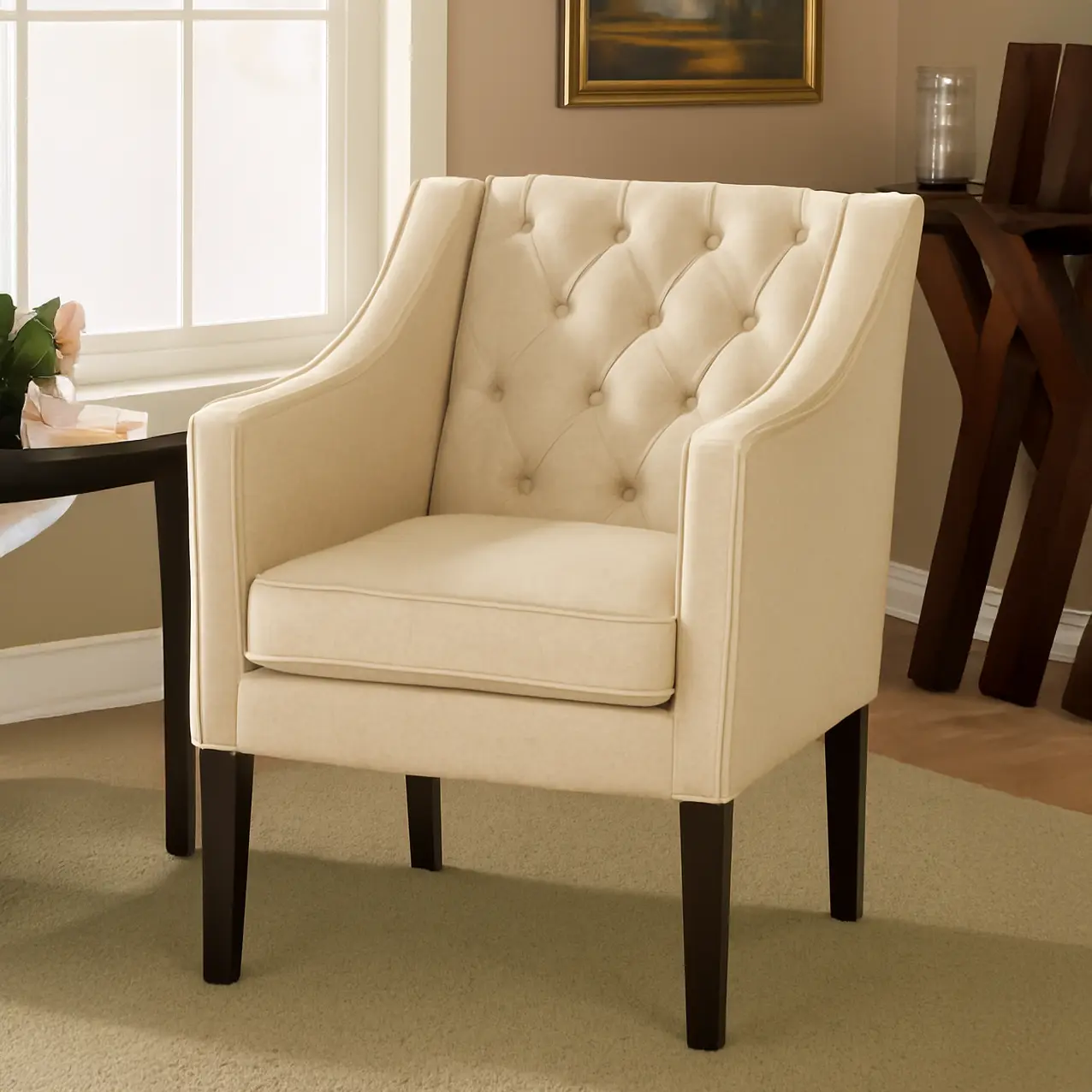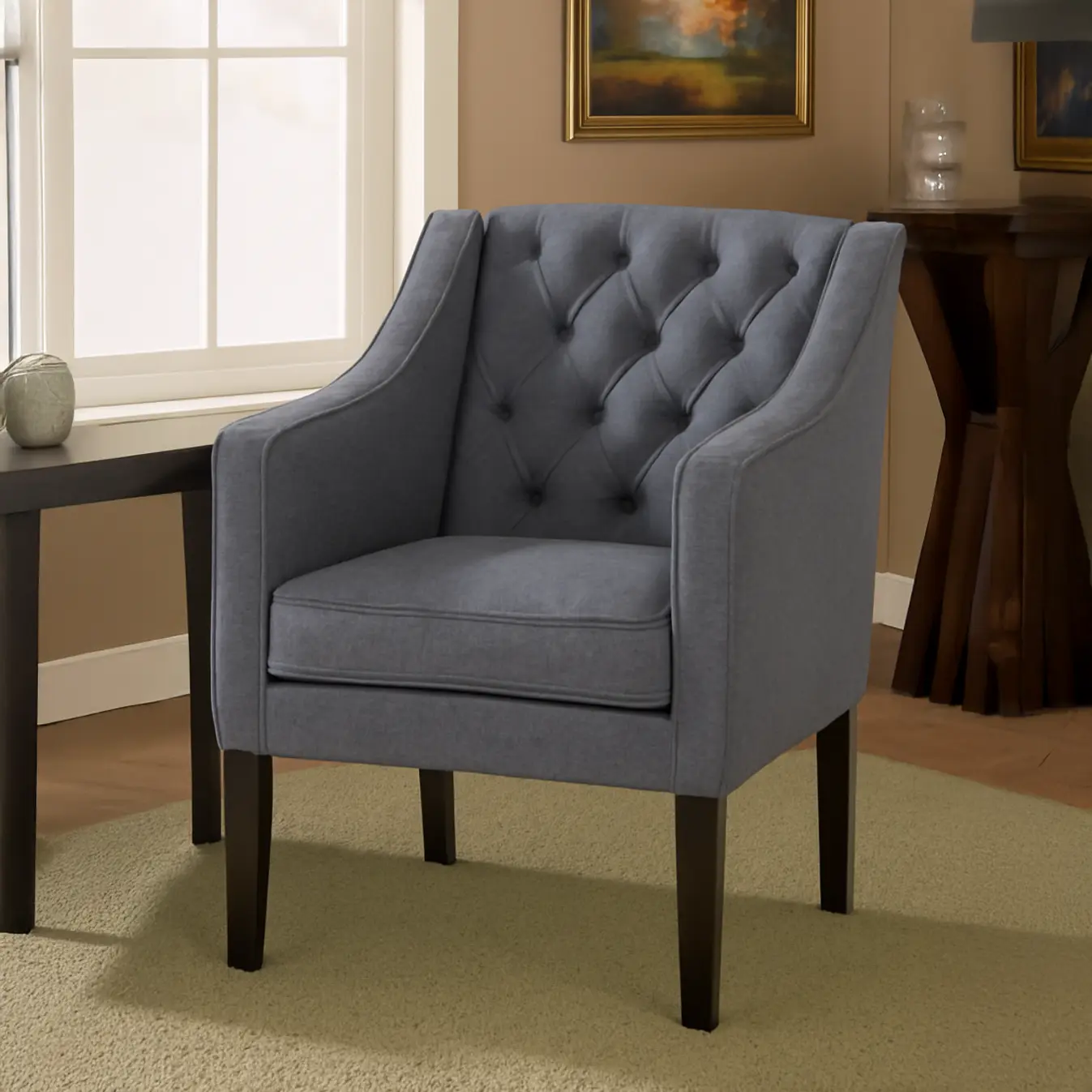 With its modest, compact size and chic elegance, Gloria Premium Button-tufted Chair has a place in any area of your home. The curved back with tufting introduces a retro design to your home while supporting your back for hours of comfortable seating, whether you’re lounging to watch a movie on your phone or just chilling to contemplate the beauty of life. A great design by Asghar Furniture.